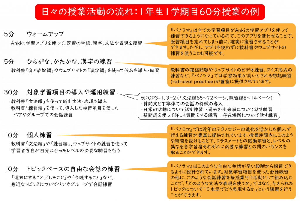 Elementary Japanese: PANORAMA is a text that introduces all of the material studied at the elementary level of Japanese in one volume. It aims to equip users with a strong foundation of Japanese language skills quickly and reliably. The text also includes the activity booklet that provides various opportunities for individual and communal practice to meet the needs of learner in diverse learning environments.