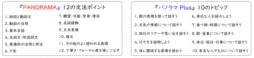 This is the website for a series of Japanese language textbooks, Elementary Japanese: PANORAMA – Fast-Track to Mastery in Just 12 Grammar Points and Pre-Intermediate Japanese: PANORAMA Plus – Stepping Toward Intermediate Through 10 Topics. The PANORAMA series helps learners who have no previous knowledge about the Japanese language achieve the intermediate language level efficiently and sustainably.